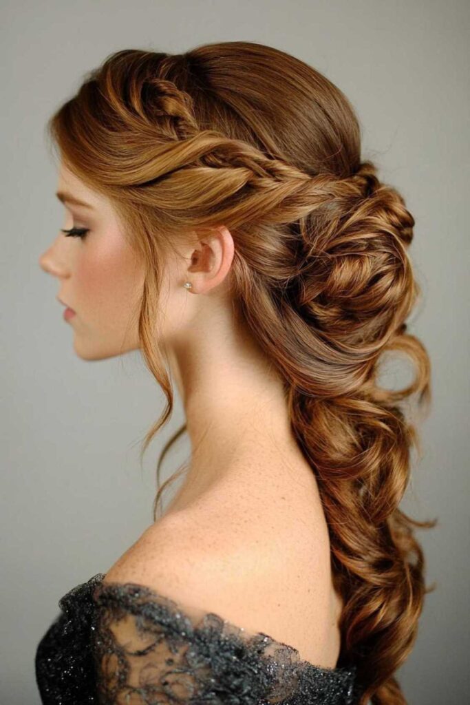 There’s something incredibly sophisticated about sweeping your hair to one side. It creates a dramatic and alluring look. This style is perfect when you want to make a statement. It’s stunning for formal parties and weddings. Make sure to secure it well with pins. This keeps it in place all evening. Complement this look with statement earrings. They will really enhance the style.