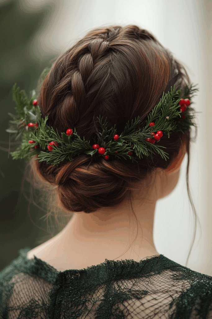 This braided updo is pure holiday magic. It’s soft and romantic. It feels wonderfully warm for Christmas gatherings. This look suits almost everyone, really. It’s a classic choice for any age. Want to add extra sparkle? Try weaving in some delicate silver or gold ribbon. It makes the braid pop beautifully.