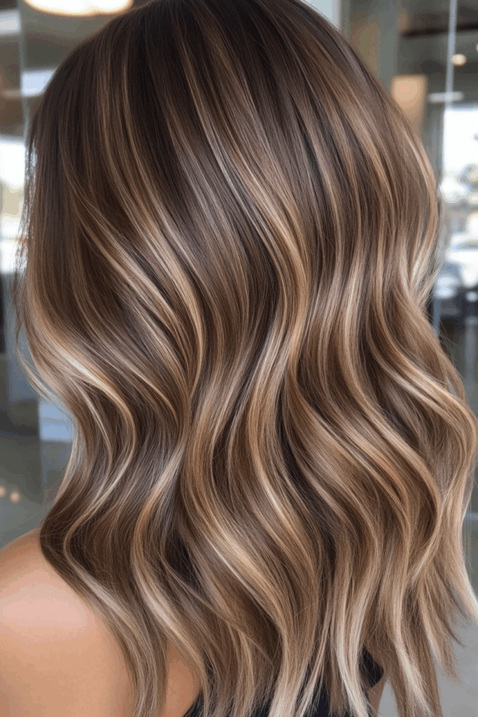 This is a rich, dark chocolate brown. We swirl in various shades of honey. This creates maximum dimension. It’s a multi-tonal effect. It looks incredibly natural and expensive.