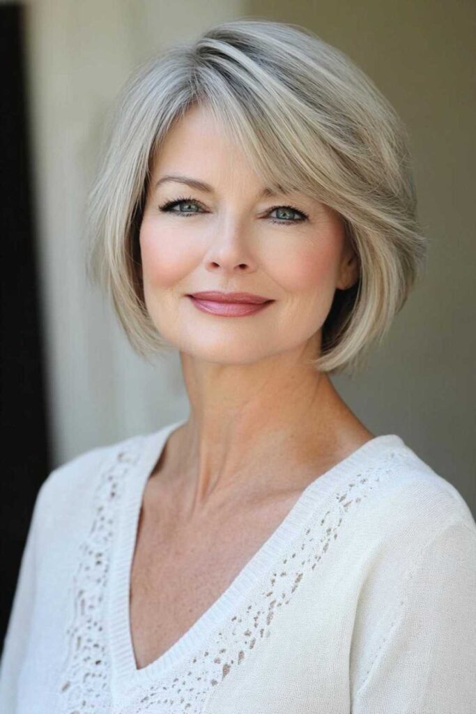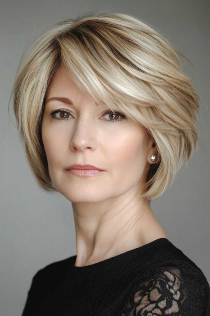 The side-swept bob is universally flattering. It’s elegant and soft. The side-swept bangs frame your face. They can soften your features. This style adds a touch of grace. It’s an ideal choice for women over 50. To achieve a smooth look, use a round brush. Blow-dry your hair away from your face. This creates a gentle lift. Use a flat iron for sleek ends. It’s polished and sophisticated.