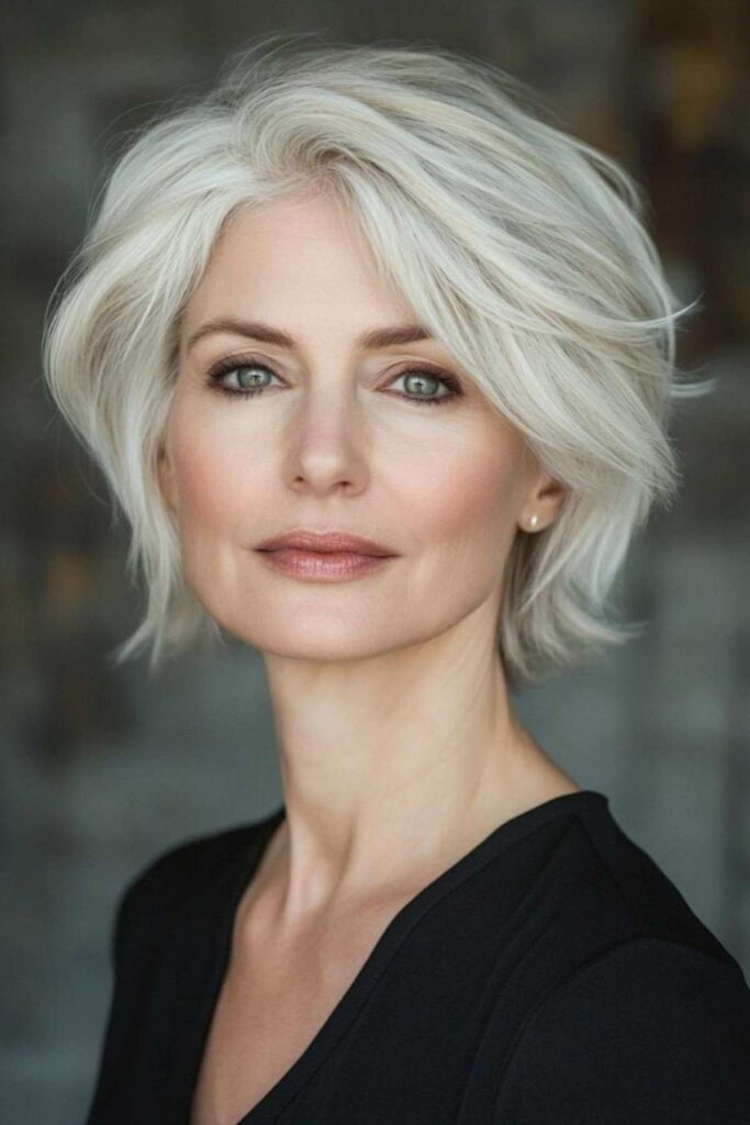 The feathered cut is soft and airy. It adds beautiful movement. This style brings a touch of lightness. It’s a great option for women over 50. You get sophistication without effort. It’s easy to manage too. Want more volume? Flip your head upside down. Use a blow dryer. Apply a volumizing mousse. Then, style as usual. This adds lift. It feels so fresh.