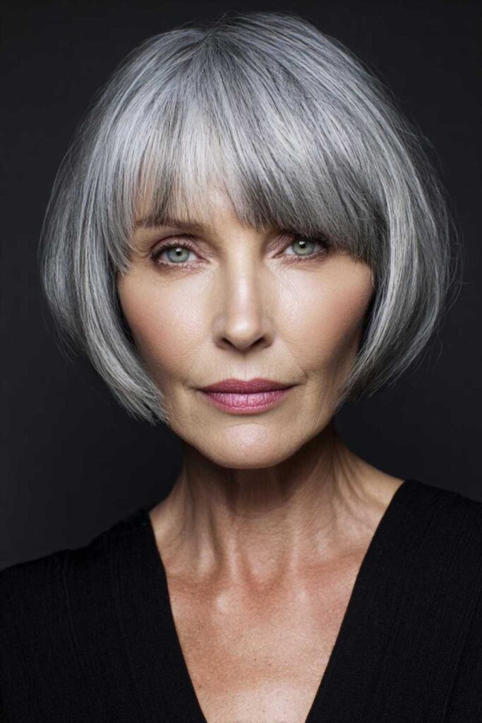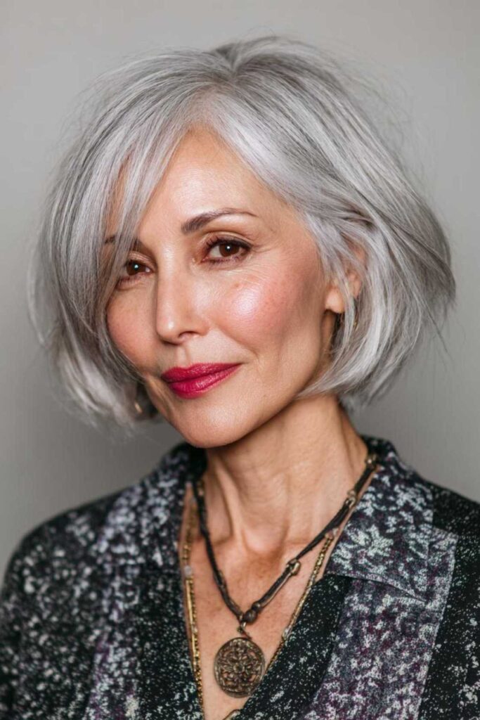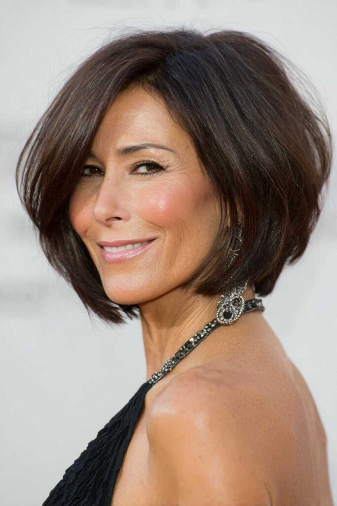 This cut is super flattering. It frames your face beautifully. The jaw-length cut is modern yet classic. Adding side bangs can soften your features. They draw attention to your eyes. This style is great for many face shapes. It offers a lovely balance. For styling the bangs, a quick sweep with a brush works wonders. You can also use a flat iron for a smooth finish. Keep them slightly swept to one side.