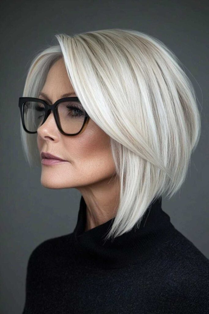 An angled mid-length cut is incredibly flattering. The hair is cut shorter in the back and gradually gets longer towards the front. This creates a beautiful angle. It draws the eye downwards, highlighting the jawline. It’s a sophisticated choice for women over 50. This cut adds a sense of movement and polish. To achieve a sleek look, blow-dry your hair with a round brush. Focus on smoothing the front pieces. A light-hold hairspray will keep everything in place. It’s a timeless style that exudes elegance. It just looks so put-together.